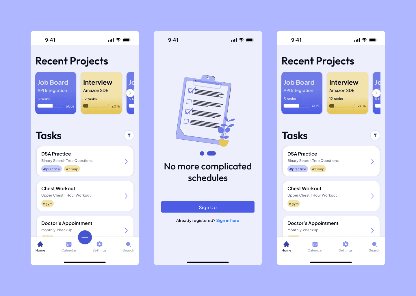 • Color Choice: I wanted to go with a color palette that was comfortable on the eyes and welcoming as the app's main goal was to reduce the user's pile of stress. I went with purple as that's the color that appealed to the app's goals the most.
